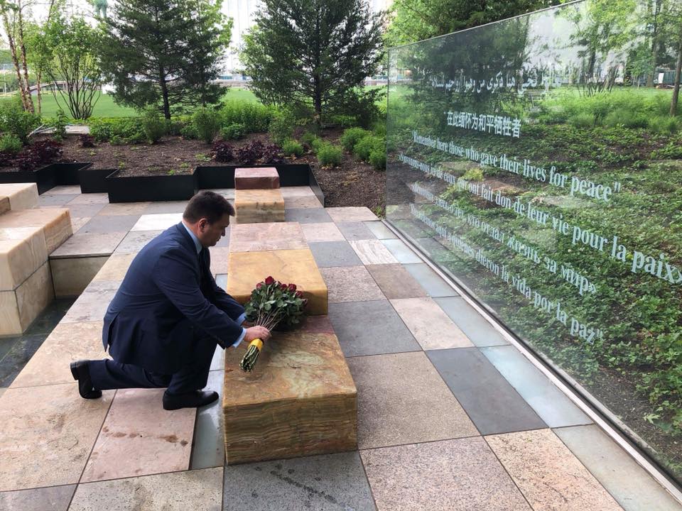 "31 красная роза в память о 31 украинце-миротворце. Именно столько наших героев отдали свои жизни за 26 лет участия Украины в миссиях ООН по поддержанию мира и безопасности во всем мире", - пояснил Климкин.