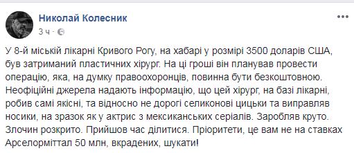 В то же время, депутат горсовета Кривого Рога Николай Колесник в Facebook написал, что "на эти деньги хирург планировал провести операцию, которая, по мнению правоохранителей, должна быть бесплатной".