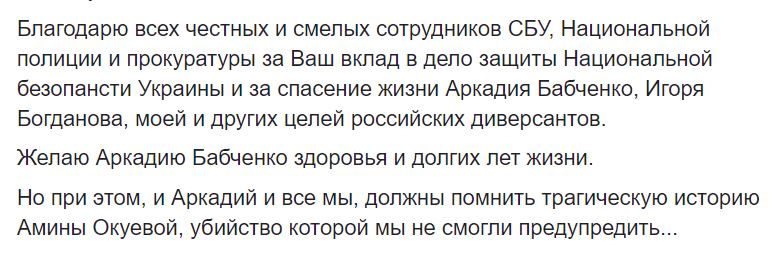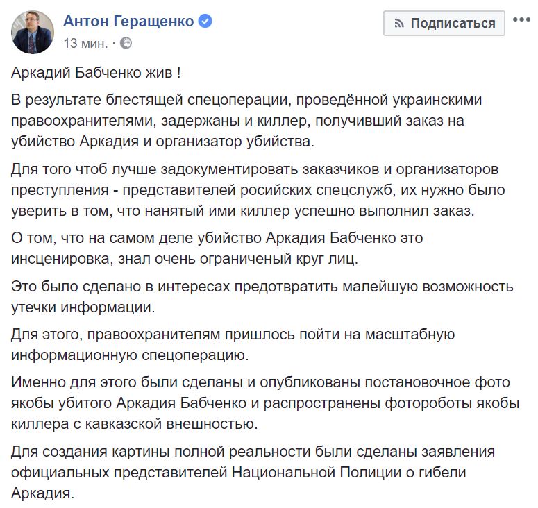 Для создания картины полной реальности были сделаны заявления официальных представителей Национальной Полиции о гибели Аркадия. Правоохранители не могли не понимать, что известие об убийстве Аркадия Бабченко отзовётся болью в тысячах сердец по всему миру. Но другого выхода у них не было", - пишет Геращенко.