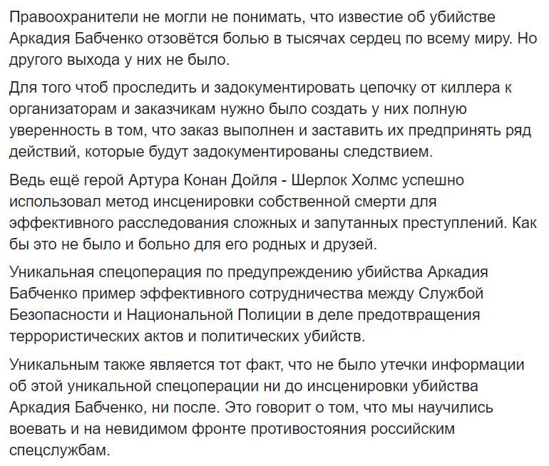"В результате блестящей спецоперации, проведённой украинскими правоохранителями, задержаны и киллер, получивший заказ на убийство Аркадия и организатор убийства. Для того чтоб лучше задокументировать заказчиков и организаторов преступления - представителей росийских спецслужб, их нужно было уверить в том, что нанятый ими киллер успешно выполнил заказ.