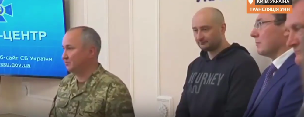 Появились фото российского журналиста Аркадия Бабченко на брифинге СБУ, в ходе которого глава ведомства Василий Грицак заявил, что история с убийством Бабченко была частью спецоперации.