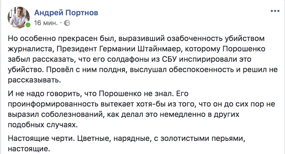 "Когда вы без толку кричите "держите волка", могут начаться проблемы, когда волк действительно придет. "Спецоперация" с Бабченко, с моей точки зрения - очень плохо пахнет. Вы могли предъявить тело погибшего Бабченко. Но если он жив, вам теперь придется предъявить и террористов, которых вы таким нехитрым образом задержали. А вы этого по-любому не сделаете, потому что они либо под следствием, либо их просто нет. А если не было убийства Бабченко, то как вы теперь докажете, что на самом деле было задержание террористов? А может и не было ничего, кроме гнилой постановки и попытки поднять чей-то рейтинг? Нельзя так поступать с людьми, просто нельзя", - пишет журналист Денис Попович.