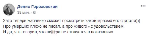 Политэксперт Денис Гороховский написал о тех, кто кинулся писать посты о журналисте: "Зато теперь Бабченко сможет посмотреть какой мразью его считали. Про умерших плохо не писал, а про живого - с удовольствием. И да, я ж говорил, что них**а не стыкуется в показаниях".
