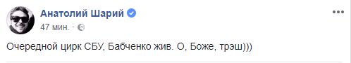 Так, блогер Анатолий Шарий написал: Очередной цирк СБУ, Бабченко жив. О, Боже, трэш)))"