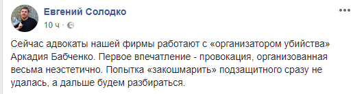 "Сейчас адвокаты нашей фирмы работают с "организатором убийства" Аркадия Бабченко. Первое впечатление – провокация, организованная весьма неэстетично. Попытка "закошмарить" подзащитного сразу не удалась, а дальше будем разбираться", – написал Солодко.
