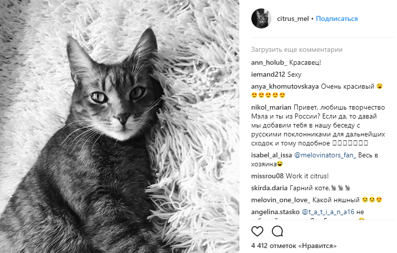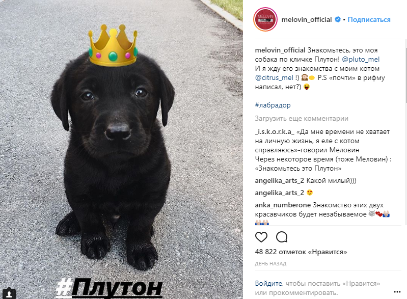 Он завел отдельный аккаунт для маленького Плутона, где можно увидеть и другие фото щенка. На него подписались уже более 7 500 человек. Собственный аккаунт в Instagram есть и у кота Melovinа - Цитруса. За жизнью этого домашнего любимца следят более 8 800 подписчиков.