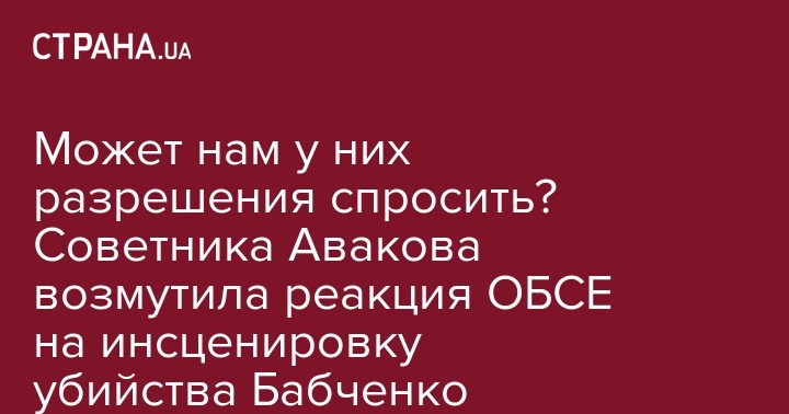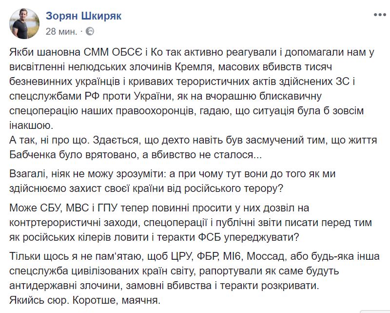 "Если бы уважаемая СММ ОБСЕ и Ко так активно реагировали и помогали нам в освещении нечеловеческих преступлений Кремля, массовых убийств тысяч невинных украинский и кровавых террористических актов осуществленных ВС и спецслужбами РФ против Украины, как на вчерашнюю молниеносную спецоперацию наших правоохранителей, думаю, что ситуация была бы совсем иной. А так, ни о чем. Кажется, что некоторые даже были расстроены тем, что жизнь Бабченко была спасен, а убийство не произошло... Вообще, никак не могу понять: а при чем тут они до того как мы осуществляем защиту своей страны от российского террора? Может СБУ, МВД и ГПУ теперь должны просить у них разрешение на контртеррористические меры, спецоперации и публичные отчеты писать перед тем как российских киллеров ловить и теракты ФСБ предупреждать?" - пишет советник министра.