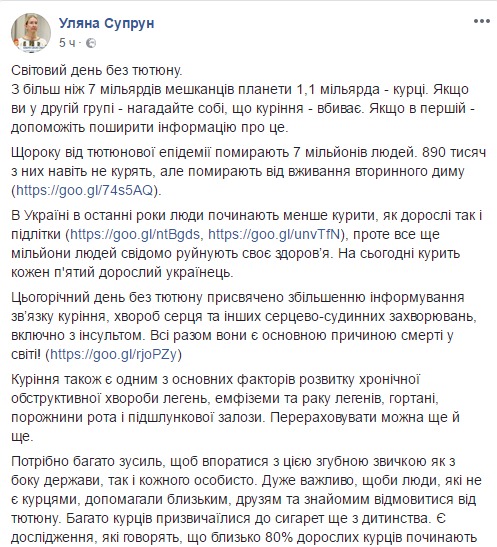 "В Украине в последние годы люди начинают меньше курить, как взрослые, так и дети, однако миллионы людей продолжают сознательно разрушать свое здоровье. По статистике, курит каждый пятый взрослый украинец", – утверждает Супрун.