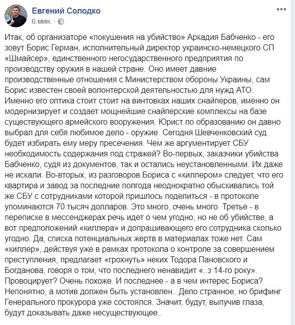 "Сегодня Шевченковский суд будет избирать ему меру пресечения. Чем же аргументирует СБУ необходимость содержания под стражей? Во-первых, заказчики убийства Бабченко, судя из документов, так и остались неустановленными. Их даже не искали. Во-вторых, из разговоров Бориса с «киллером» следует, что его квартира и завод за последние полгода неоднократно обыскивались той же СБУ с сотрудниками которой пришлось поделиться - в протоколе упоминаются 70 тысяч долларов. Это много, очень много. Третье - в переписке в мессенджерах речь идет о чем угодно, но не об убийстве, а вот предположений «киллера» и допрашивающего его сотрудника сколько угодно. Да, списка потенциальных жертв в материалах тоже нет. Сам "киллер", действуя уже в рамках протокола о контроле за совершением преступления, предлагает "грохнуть" неких Тодора Пановского и Богданова, говоря о том, что последнего ненавидит "..з 14-го року". Провоцирует? Очень похоже. И последнее - а в чем интерес Бориса? Непонятно, а мотив должен быть установлен...Дело странное, но брифинг Генерального прокурора уже состоялся. Значит, будут, выпучив глаза, будут доказывать даже несуществующее", - пишет Солодко.