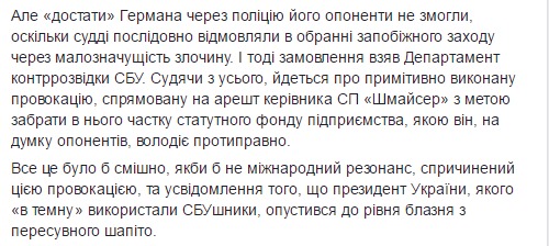 "Достать" Германа через полицию его оппоненты не смогли, поскольку судьи последовательно отказывали в избрании меры пресечения из малозначимость преступления. И тогда заказ взял Департамент контрразведки СБУ. Судя по всему, речь идет про примитивно выполненную провокацию, направленную на арест руководителя СП "Шмайсер". с целью забрать у него долю уставного фонда предприятия, которым он, по мнению оппонентов, обладает противоправно. Все это было бы смешно, если бы не международный резонанс, вызванный этой провокацией, и осознание того, что президент Украины, которого в "темную" использовали СБУшники, опустился до уровня шута из передвижного шапито, - написал Бойко.