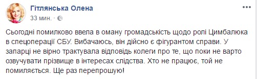 "Сегодня ошибочно ввела в заблуждение общественность о роли Цымбалюка в спецоперации СБУ. Извиняюсь, он действительно является фигурантом дела. В запарке неверно трактовала ответ коллеги о том, что пока не стоит озвучивать фамилию в интересах следствия. Кто не работает, тот не ошибается. Еще раз извиняюсь!", - написала она.