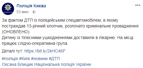 На странице полиции Киева в Фейсбуке около 23:00 появилось сообщение о том, что ДТП произошло при участии полицейского спецавтомобиля.