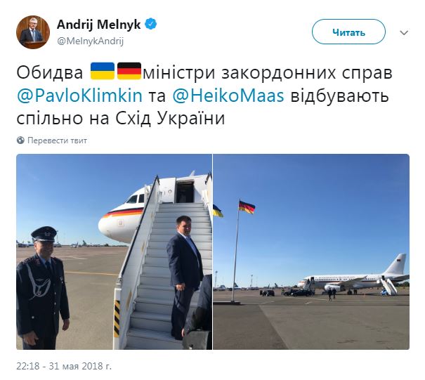 "Оба министра иностранных дел Павел Климкин и Хайко Маас отбывают совместно на восток Украины", - написал Мельник.