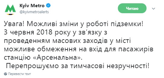 "3 июня 2018 в связи с проведением массовых мероприятий в городе возможно ограничение на вход для пассажиров станции "Арсенальная". Приносим извинения за временные неудобства!" - говорится в сообщении.