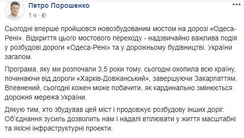 На Facеbook Порошенко заявил, что сегодня каждый может увидеть, как кардинально меняется дорожная сеть Украины.