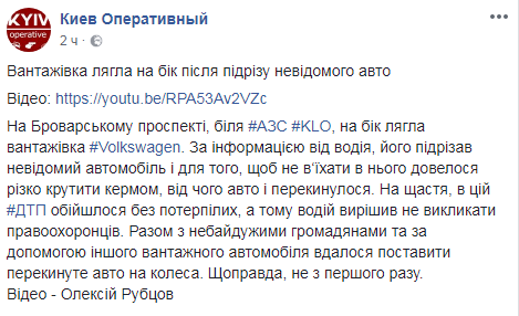 В Киеве на Броварском проспекте, возле АЗС KLO, перевернулся грузовик Volkswagen.