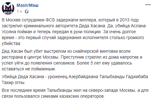 Напомним, что дед Хасан был убит выстрелом из снайперской винтовки возле ресторана в центре Москвы. Преступник стрелял из дома напротив и успел уйти до появления полиции. Преступник скрывался более пяти лет.