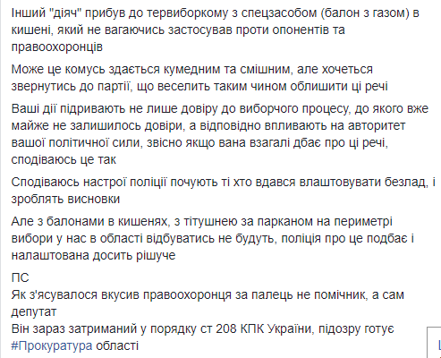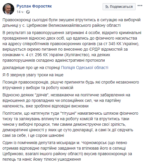 "Один из помощников депутата горсовета Черноморска (вероятно получил соответствующее партийное задание и воплощал его в поселке Цебриково, вообще другого района области) укусил полицейского за палец и нанес ему телесные повреждения", – отметил Форостяк.
