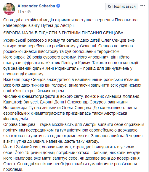 "Дело Сенцова - хорошая возможность для Австрии проявить себя настоящим политическим посредником и гуманистическим европейским государством, которая готова вступиться за одну отдельную жизнь. Планируемый на 5 июня визит Путина в Вену, наверняка, даст такую ​​возможность", - сообщил он.
