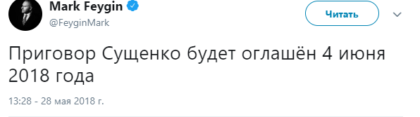 "Приговор Сущенко будет оглашён 4 июня 2018 года", - говорится в сообщении.