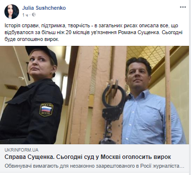 Корреспондент украинского агентства УНИАН в Москве Роман Цимбалюк также будет сегодня на суде. Он сообщил, что наденет майку с портретом Сущенко и надписью #FreeSushchenko ("Освободите Сущенко!")
