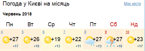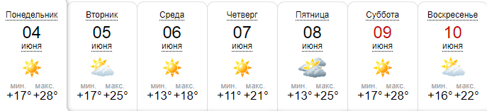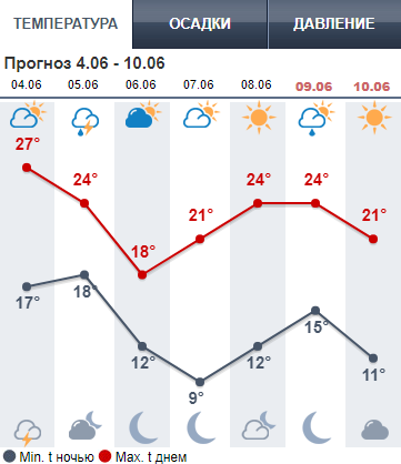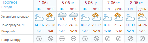 Ресурс Мeteoprog.ua обещает дождь во вторник и субботу, 5 июня - с грозой. В понедельник до +27. В среду и четверг похолодает до +18...+21. В пятницу и субботу прогнозируют до +24, а в воскресенье +21.