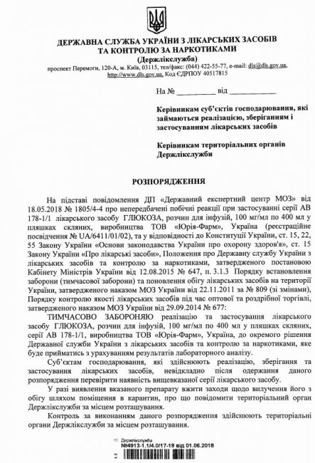 Госслужба также временно установила запрет на реализацию и применение лекарственного средства "Глюкоза" (раствор для инфузий, 100 мг/мл по 400 мл в бутылках стеклянных, серия АВ 178-1/1, производства ООО "Юрія-Фарм").
