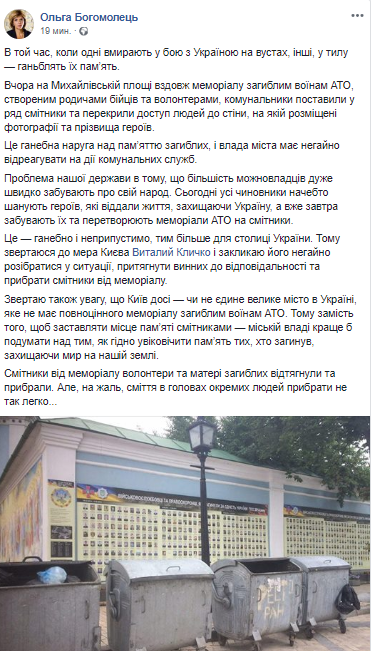 Проблема нашего государства в том, что большинство чиновников очень быстро забывают о своем народе. Сегодня все чиновники вроде уважают героев, отдавших жизнь, защищая Украину, а уже завтра забывают их и превращают мемориалы АТО в свалки", - написла Богомолец в соцсети и призвала мэра Киева Виталия Кличко немедленно разобраться в ситуации, привлечь виновных к ответственности и убрать мусорники от мемориала.