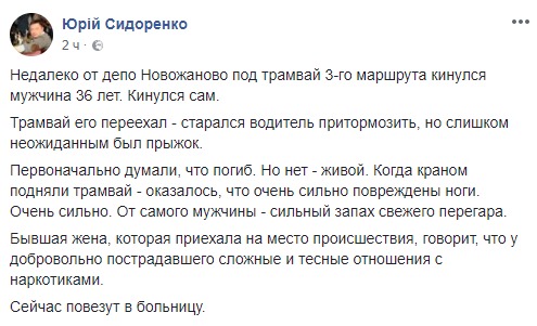 В свою очередь директор департамента информации и связей со средствами массовой информации Харьковского горсовета Юрий Сидоренко рассказал на своей странице в Facebook, что мужчина прыгнул под трамвай сам.