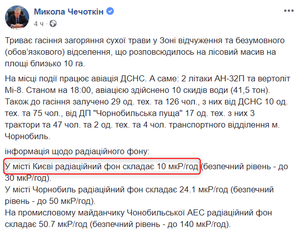 Так, к 17:00 вторника, 5 мая в Киеве сообщалось о 10 микрорентген в час. А в уже в 21:00 руководитель ГосЧС заявил о 12-ти мкР/час.