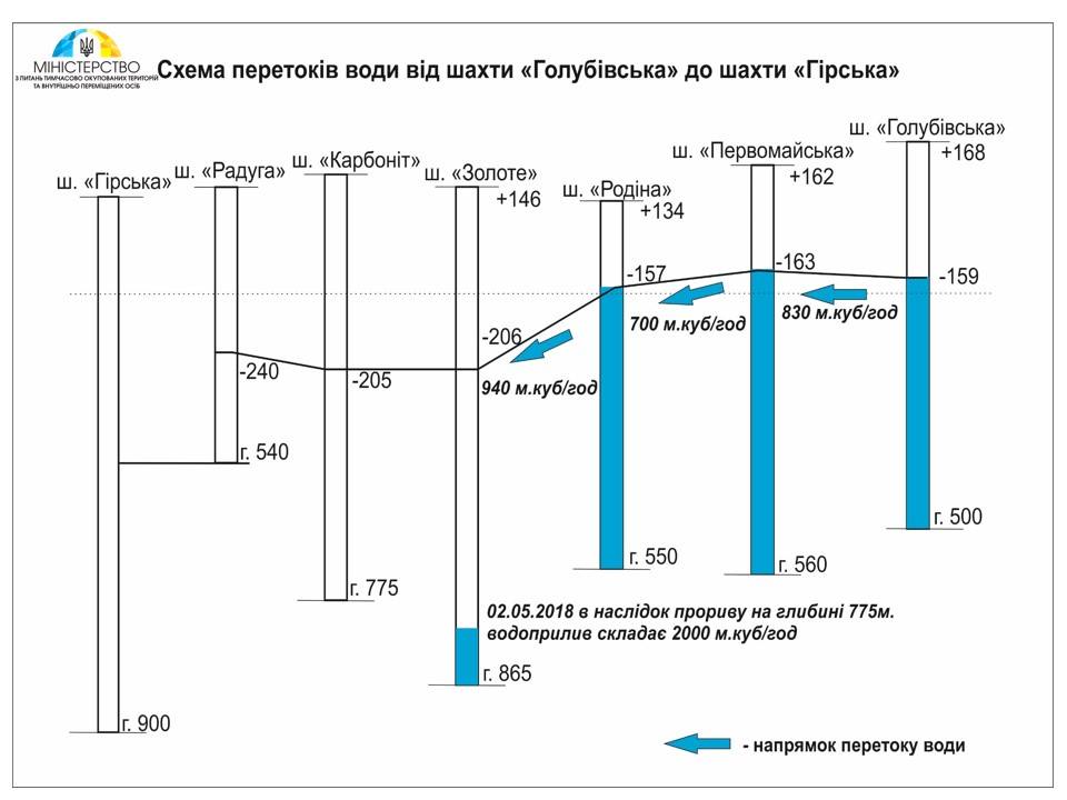 "Процесс затопления шахт начинается на оккупированной территории и постепенно достигает шахт, расположенных на контролируемой правительством территории. Обратите внимание: объем шахтных вод, поступающих в шахту "Золотое" (контролируемая территория) составляет 940 тонн в час", - написал Тука на своей странице в Facebook.
