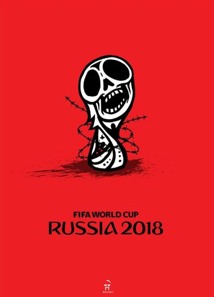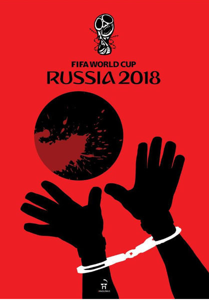 На плакатах Ермоленко, в частности, изображены катастрофа рейса MH-17 и окровавленный талисман чемпионата, который проводится в России.