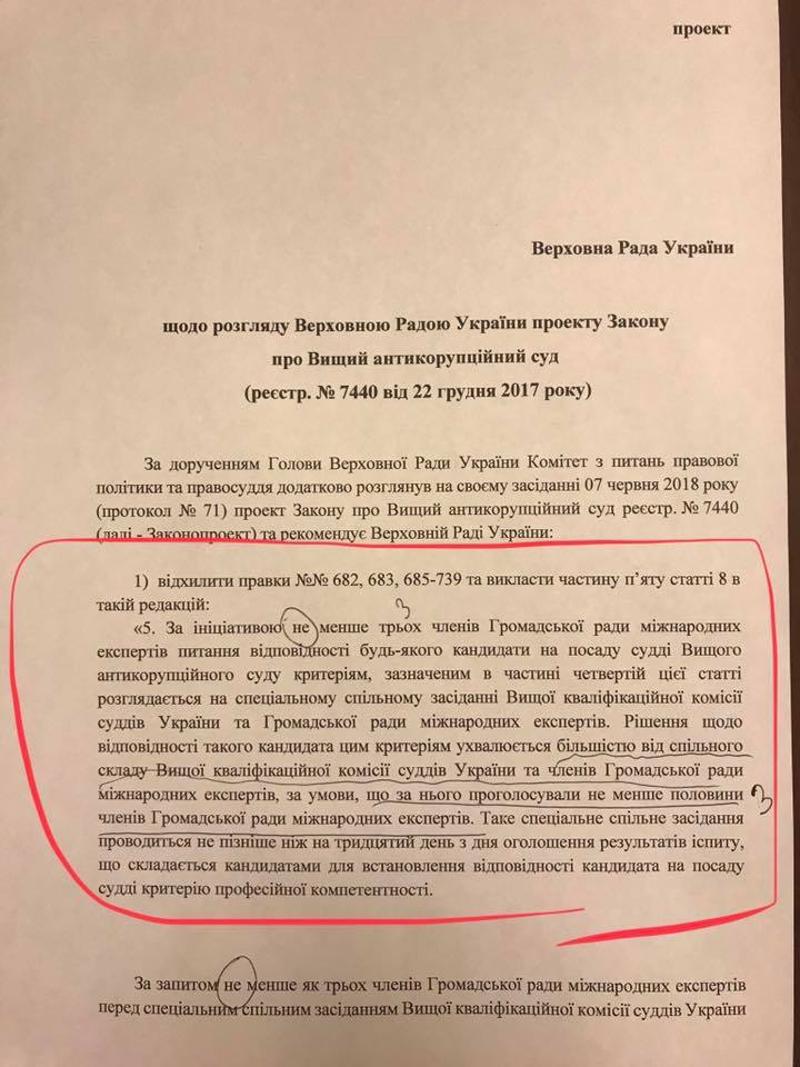 Если же таких голосов будет хотя бы 4, то окончательное решение останется за Общественным советом международных экспертов, что не допустит нечестных кандидатов в судьи. Только так мы получим настоящий антикоррупционный суд", - написал нардеп.