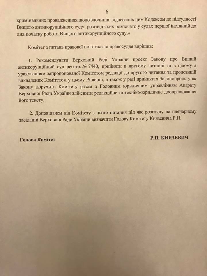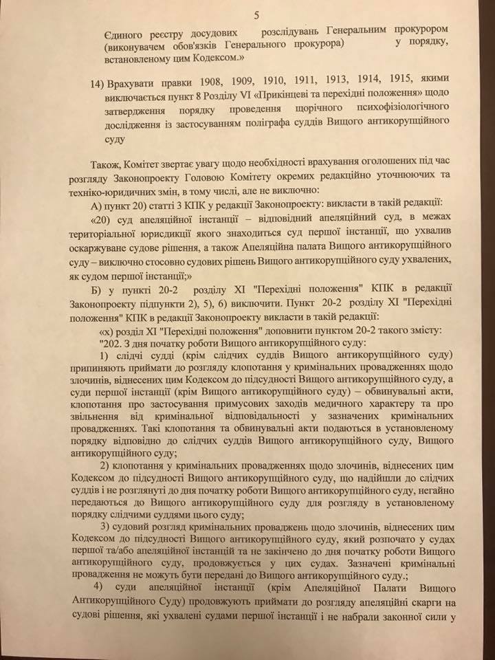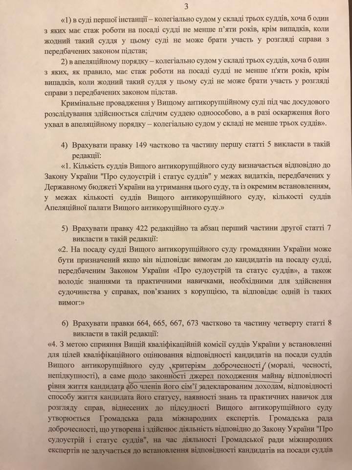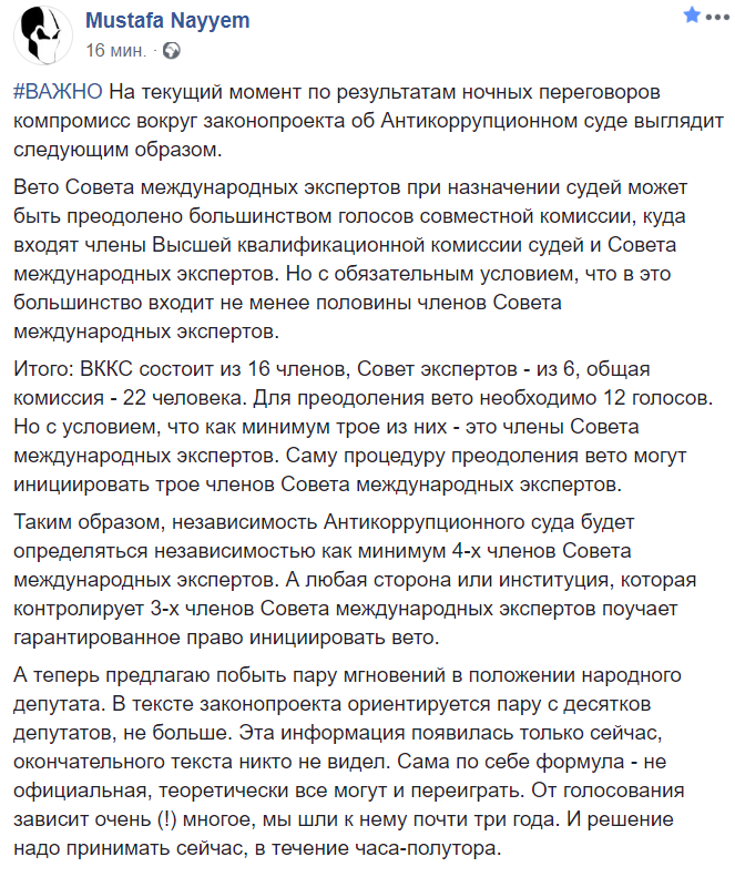 "На текущий момент по результатам ночных переговоров компромисс вокруг законопроекта об Антикоррупционном суде выглядит следующим образом.
