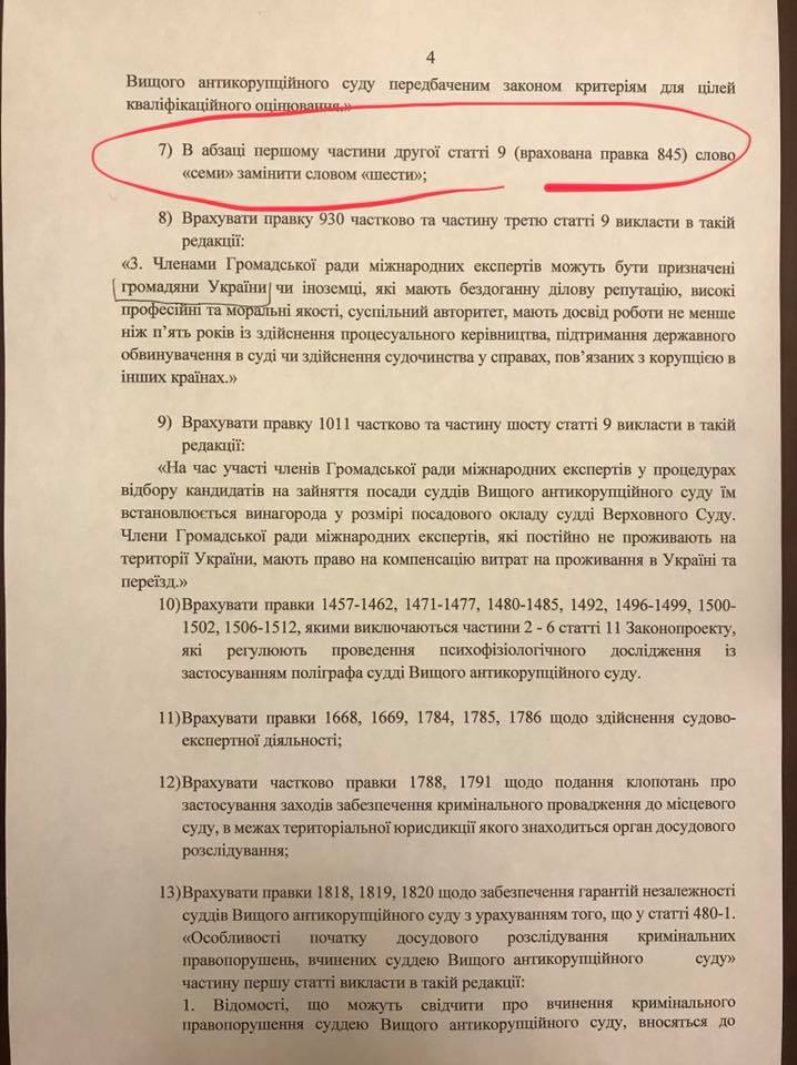 То есть, для контроля над подбором судей Банковая должна заангажировать трех из шести членов Совета международных экспертов. И еще одна поправка - в этот Совет международных экспертов могут входить не только иностранцы, но и граждане Украины", - написал Лещенко.