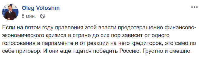 11:01 "Если на пятом году правления этой власти предотвращение финансово-экономического кризиса в стране до сих пор зависит от одного голосования в парламенте и от реакции на него кредиторов, это само по себе приговор. И они ещё тщатся победить Россию. Грустно и смешно", - реагирует на происходящее в парламенте политолог Олег Волошин.