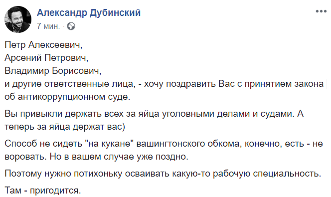 и другие ответственные лица, - хочу поздравить Вас с принятием закона об антикоррупционном суде.
