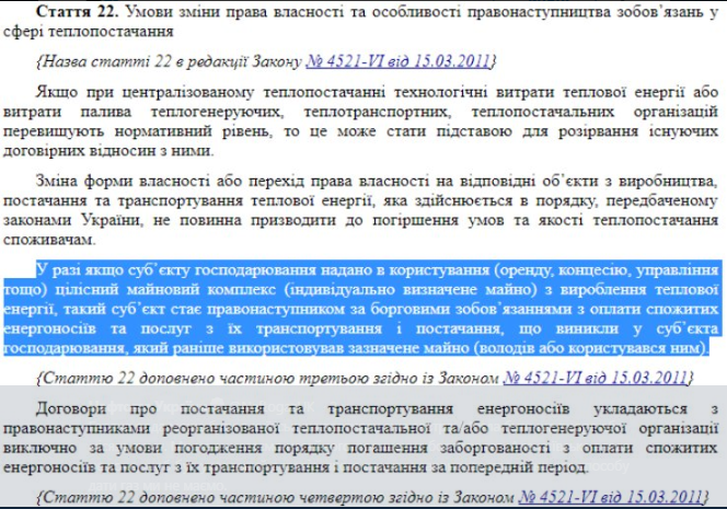 К тексту прикреплено фото положения законодательства Украины. в котором говорится, что субъекты хозяйствования, которые получили в пользование комплексы тепловой энергии, становятся правонаступниками существующих долгов и берут на себя долговые обязательства.
