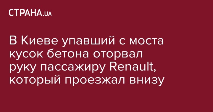 В четверг, 7 июня, на проспекте Победы в Киеве с Берестейского моста упал кусок бетона, который рухнул на проезжавший автомобиль. Пассажир авто, проезжавшего в тот момент под путепроводом, получил серьезную травму.