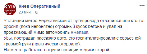 "У станции метро Берестейской от путепровода отвалился или кто-то бросил (пока непонятно) огромный кусок бетона и упал на проезжающий мимо автомобиль Renault.  Увы, пострадал пассажир авто, его госпитализировали с серьезной травмой руки (практически оторвало)", - говорится в сообщении.