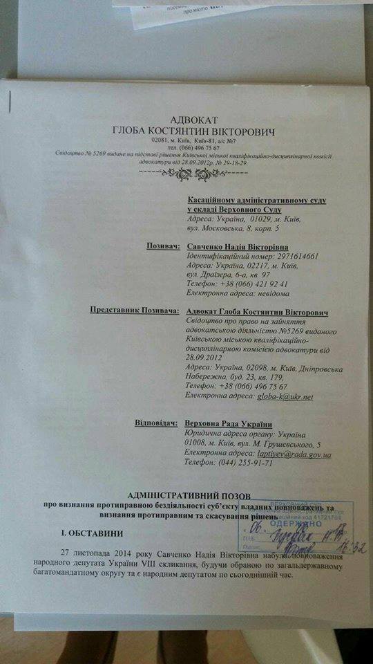На первой странице размещенной в соцсети фотокопии иска указано, что он подан адвокатом Константином Глобой в Кассационный административный суд в составе Верховного суда.
