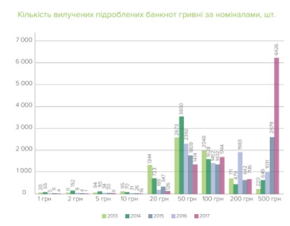 Львиная доля фальшивок пришлась на самые крупные, 500-гривневые купюры. Их нашли 6426 экземпляров. В 2016 году так подделок было чуть больше 2,6 тыс. штук, передает UBR.
