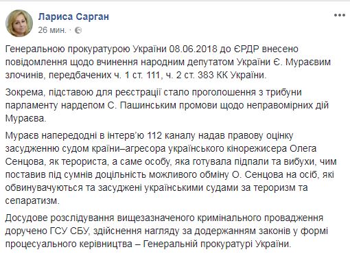 "Генеральной прокуратурой Украины 08.06.2018 в ЕРДР внесено сообщение о совершении народным депутатом Украины Мураевым преступлений, предусмотренных ч. 1 ст. 111 (госизмена), ч. 2 ст. 383 (заведомо неправдивая информация) УК Украины. В частности, основанием для регистрации стало провозглашение с трибуны парламента нардепом. Пашинским речи о неправомерных действиях Мураева", - пишет Сарган.
