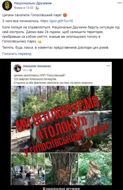 По словам сотрудника НПП "Голосеевский" Александра Соколенко, представители лесхоза впоследствии попросили активистов о "помощи" в уборке территории. На призыв откликнулись "Национальные дружины". На опубликованном в сети видео видно, как представители этой организации с топорами и молотками разрушают палатки, оставленные цыганами.