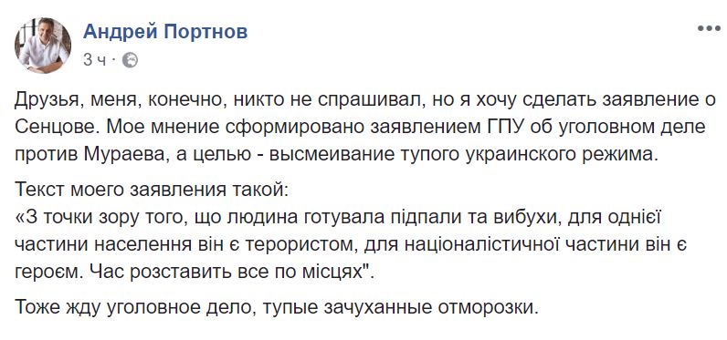 "Друзья, меня, конечно, никто не спрашивал, но я хочу сделать заявление о Сенцове. Мое мнение сформировано заявлением ГПУ об уголовном деле против Мураева, а целью - высмеивание тупого украинского режима.