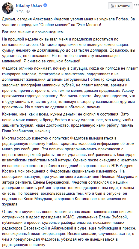 "Друзья, сегодня Александр Федотов уволил меня из журнала Forbes. За участие в передаче "Особое мнение" на "Эхе Москвы".