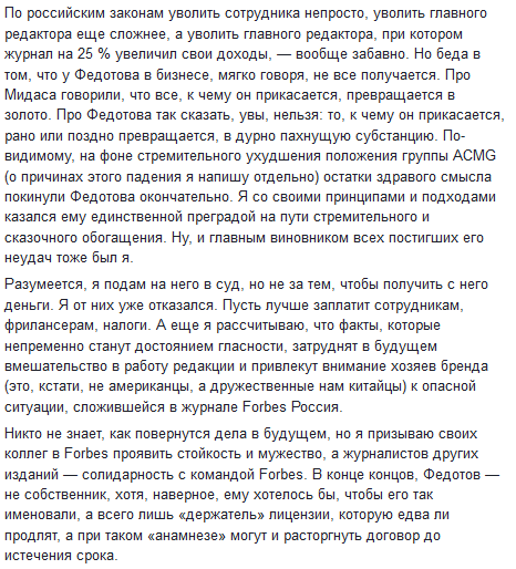 Столкнувшись с независимой позицией главного редактора и ряда ведущих сотрудников, Федотов решил попытаться изменить устав редакции Forbes так, чтобы превратить редакцию в послушный инструмент своих прихотей и фантазий. Его версия нового устава у меня имеется, и я еще повеселю почтенную публику этими "Законами Хаммурапи". Скажу лишь, что я наотрез отказался их подписывать, предупредив, что вынужден буду обратиться к хозяевам бренда, команде и в прессу. Этого мне не простили.