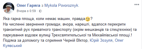 "Какая красивая площадь, когда нет машин, правда? На многочисленные обращения общины, вчера, наконец, удалось перекрыть транзитное движение частного транспорта (кроме жителей и спецтехники) и парковки вдоль улицы Трехсвятительская и Михайловской площади. Благодарность за помощь и содействие Черний Виктор, Юрий Зозуля, Олег Куявский", - написал Олег Гаряга.