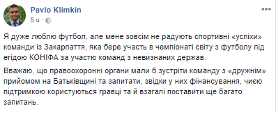 Министр иностранных дел Украины Павел Климкин возмущен участием футбольной сборной "Закарпатье" в Чемпионате мира среди непризнанных и частично признанных стран, автономий и этнических команд. Об этом он написал на своей странице в Facebook.