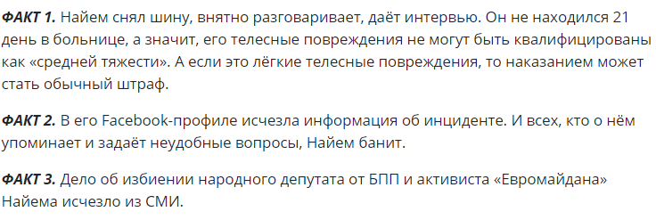 Впрочем, политик Геннадий Балашов уверен, что денежное вознаграждение могло иметь место в истории с избиением Найема по ряду фактов. Он их привел на своем сайте.